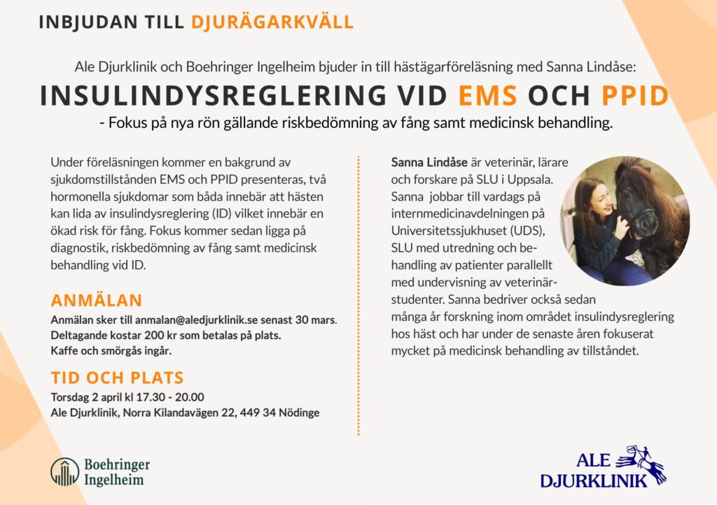 Under kvällen ska vi lära oss mer om de hormenella sjukdomarna EMS och PPID, varför hästen får fång när den lider av insulindysreglering. Hur man ställer en diagnos på sjukdomen, vilka prover ska tas och hur? Vilka medicinska behandlingar finns?